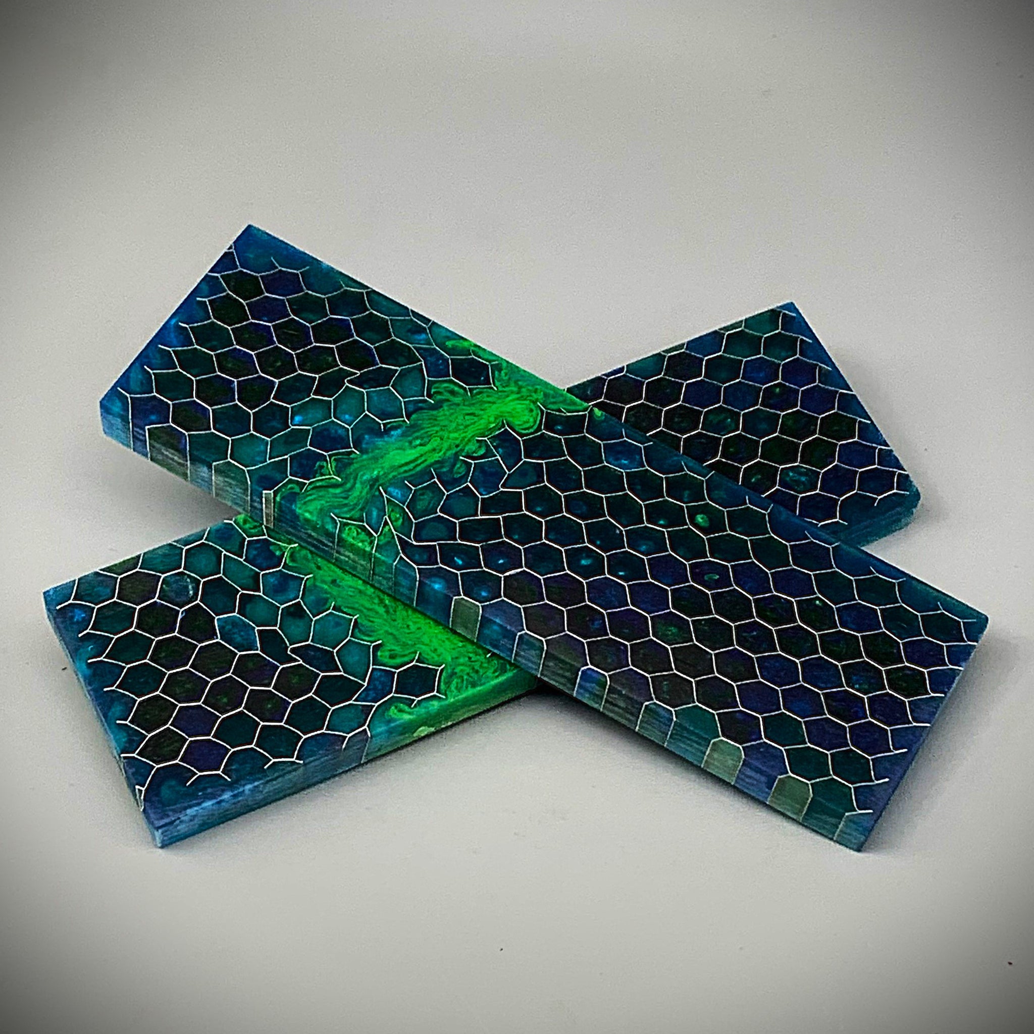 Distressed Aluminum Honeycomb: Easily workable with ordinary shop tools and securely bonded at the metal-resin interface through a unique 5-step etching process. Each piece is individually hand-cut and set in place to highlight the twisted geometry of the aluminum hex.