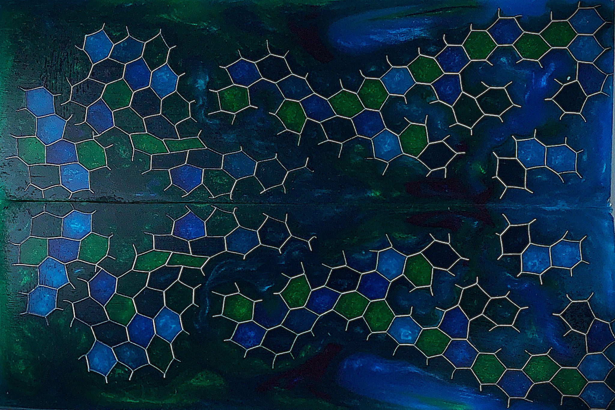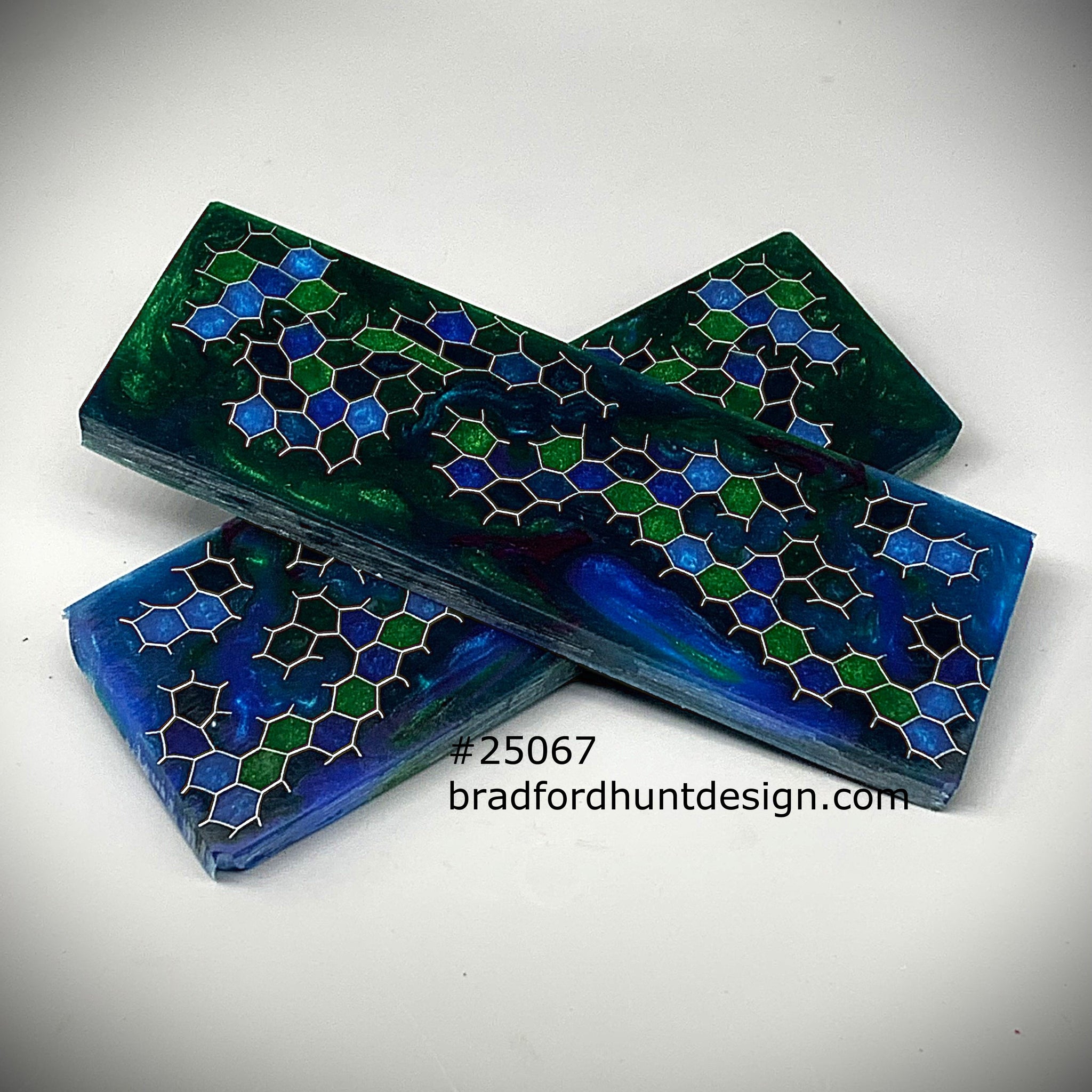 These custom knife scales are composed of hand-formed, distressed aluminum honeycomb surrounded by shimmering blue and green urethane resin.