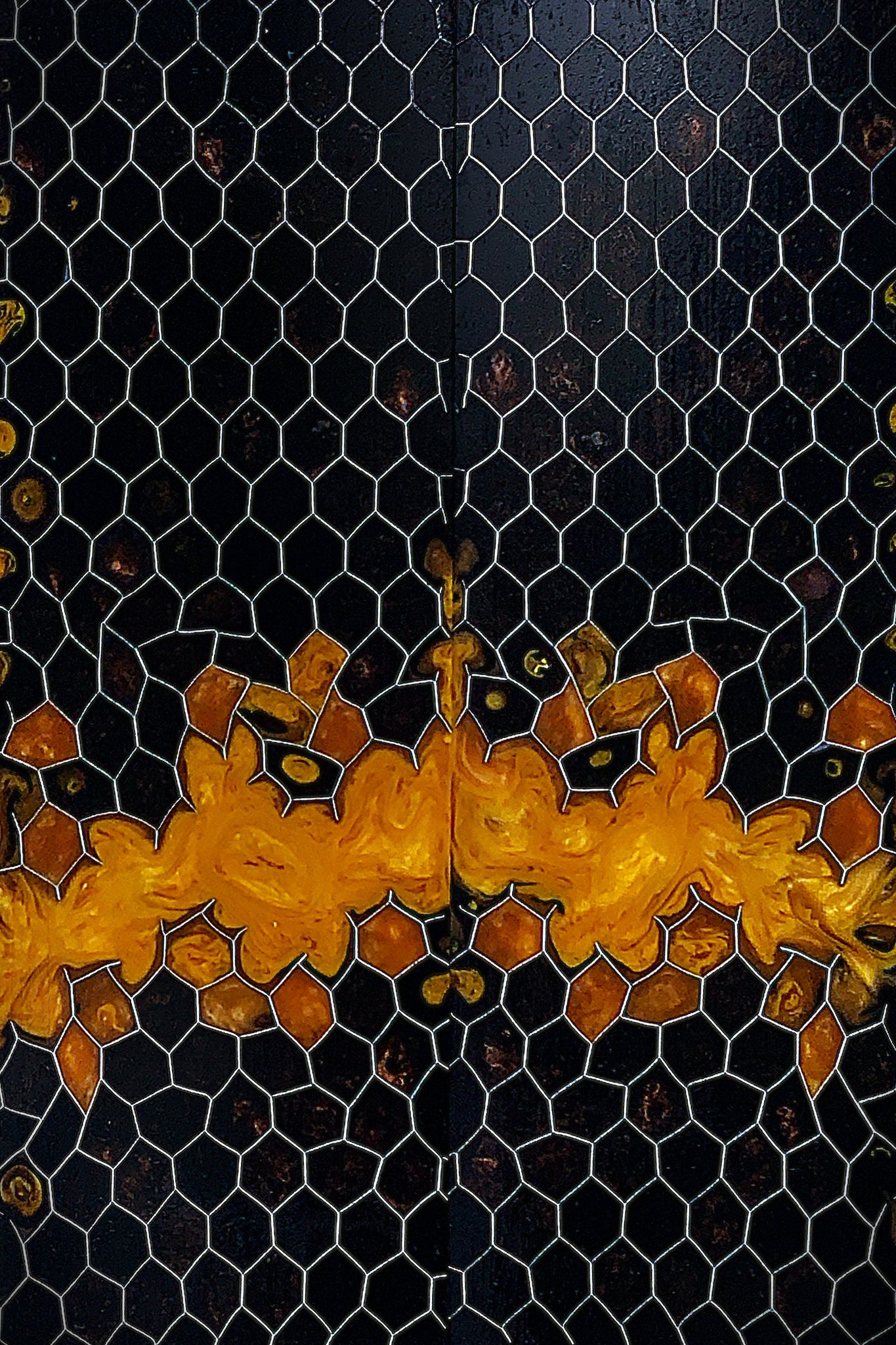 Distressed Aluminum Honeycomb: Easily workable with ordinary shop tools and securely bonded at the metal-resin interface through a unique 5-step etching process. Each piece is individually hand-cut and set in place to highlight the twisted geometry of the aluminum hex.