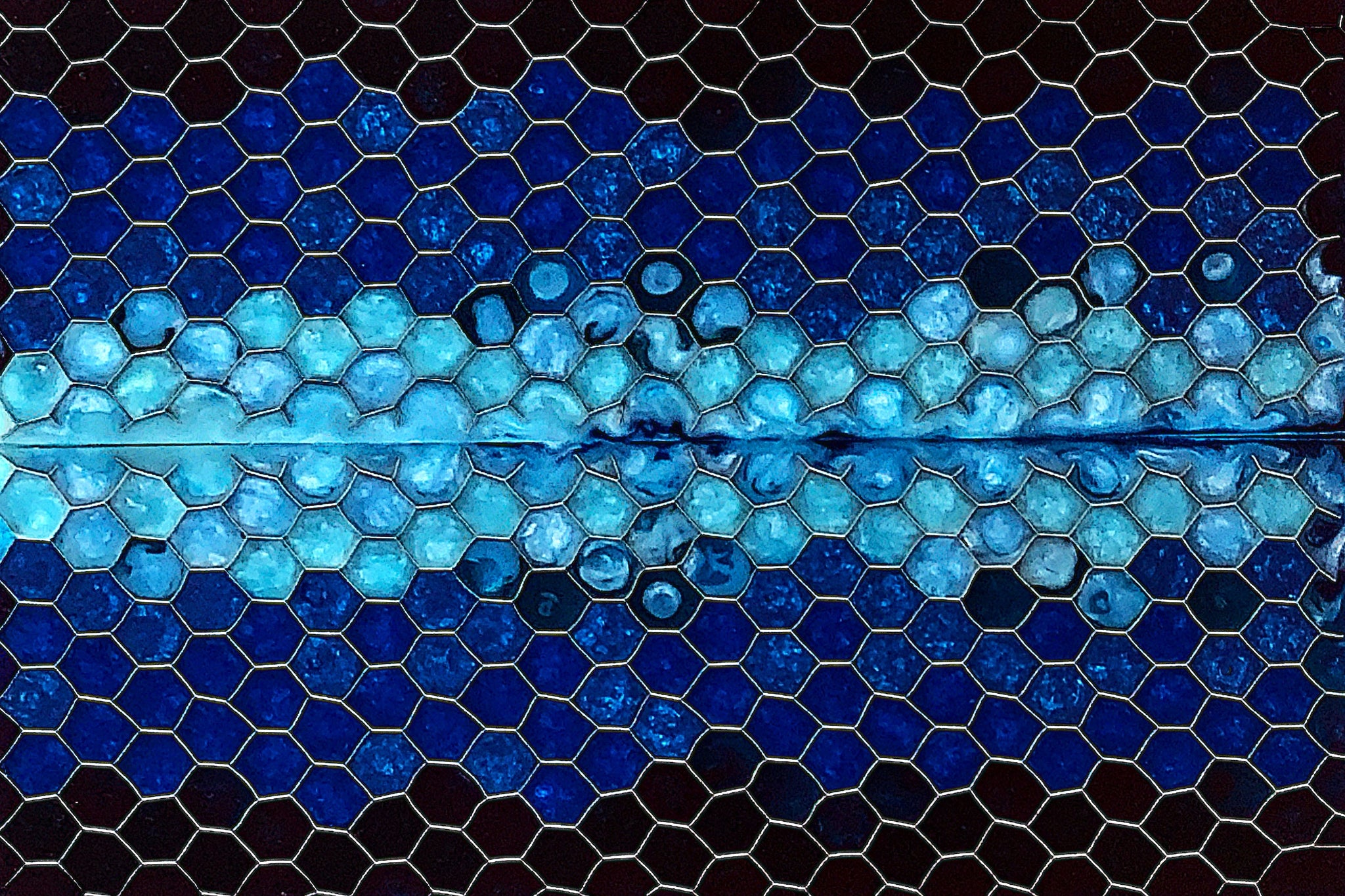 These custom knife scales are composed of hand-formed, distressed aluminum honeycomb surrounded by shimmering blue and green urethane resin.
