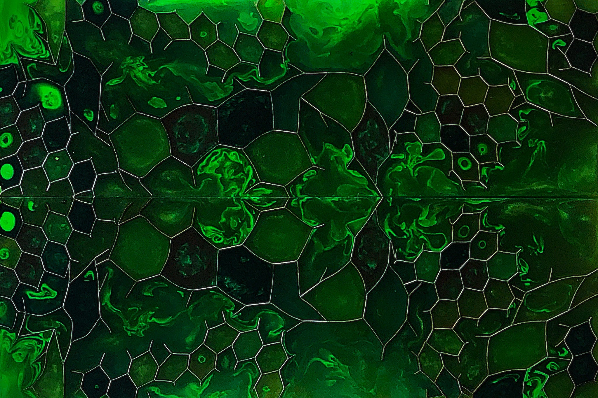 Distressed Aluminum Honeycomb: Easily workable with ordinary shop tools and securely bonded at the metal-resin interface through a unique 5-step etching process. Each piece is individually hand-cut and set in place to highlight the twisted geometry of the aluminum hex.
